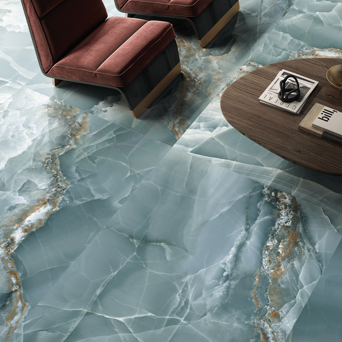 Our Nuvole Onyx range is different from our other onyx-effect tiles because of its matt finish. It reaches the PTV 36+ rating required for commercial floors, making it versatile and practical. It is still reasonably smooth to the touch but this new advanced surface repels water enabling the high anti-slip rating. There are five vivid colours and a sizes ranging from 60x120cm up to an impressive 120x278cm. This range also comes in a polished finish. It is suitable for both walls and floors and works well in both bathrooms and kitchens. Prices start from £94.00 per square metre.
