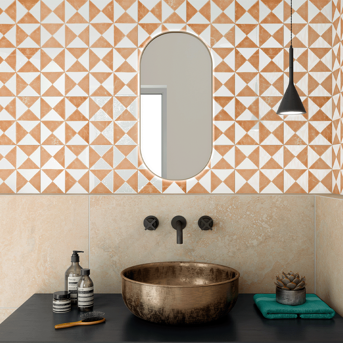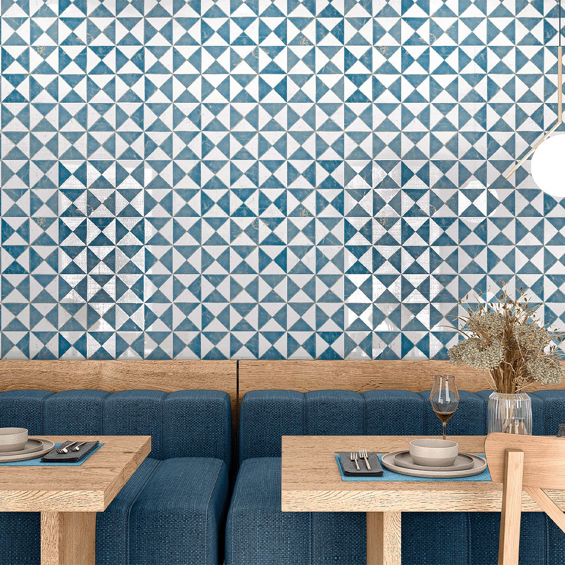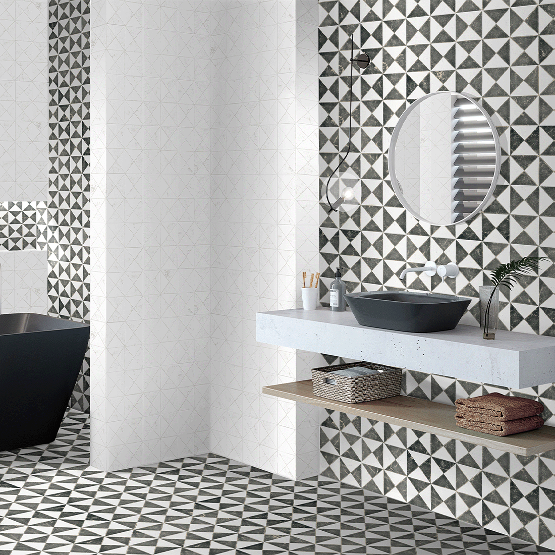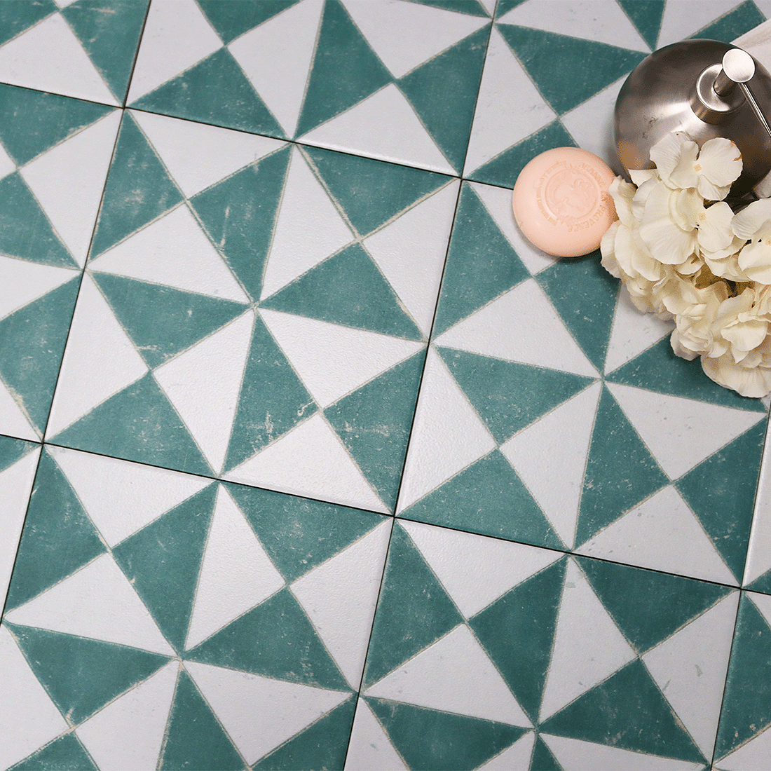Parisienne Tri is a collection of four patterned tiles and takes its name from the triangular shapes within the designs. It features one dramatic geometric pattern but comes in four bold colours, black, blue, green and orange. This collection is 22x22cm. Prices start from £68.00 per square metre.