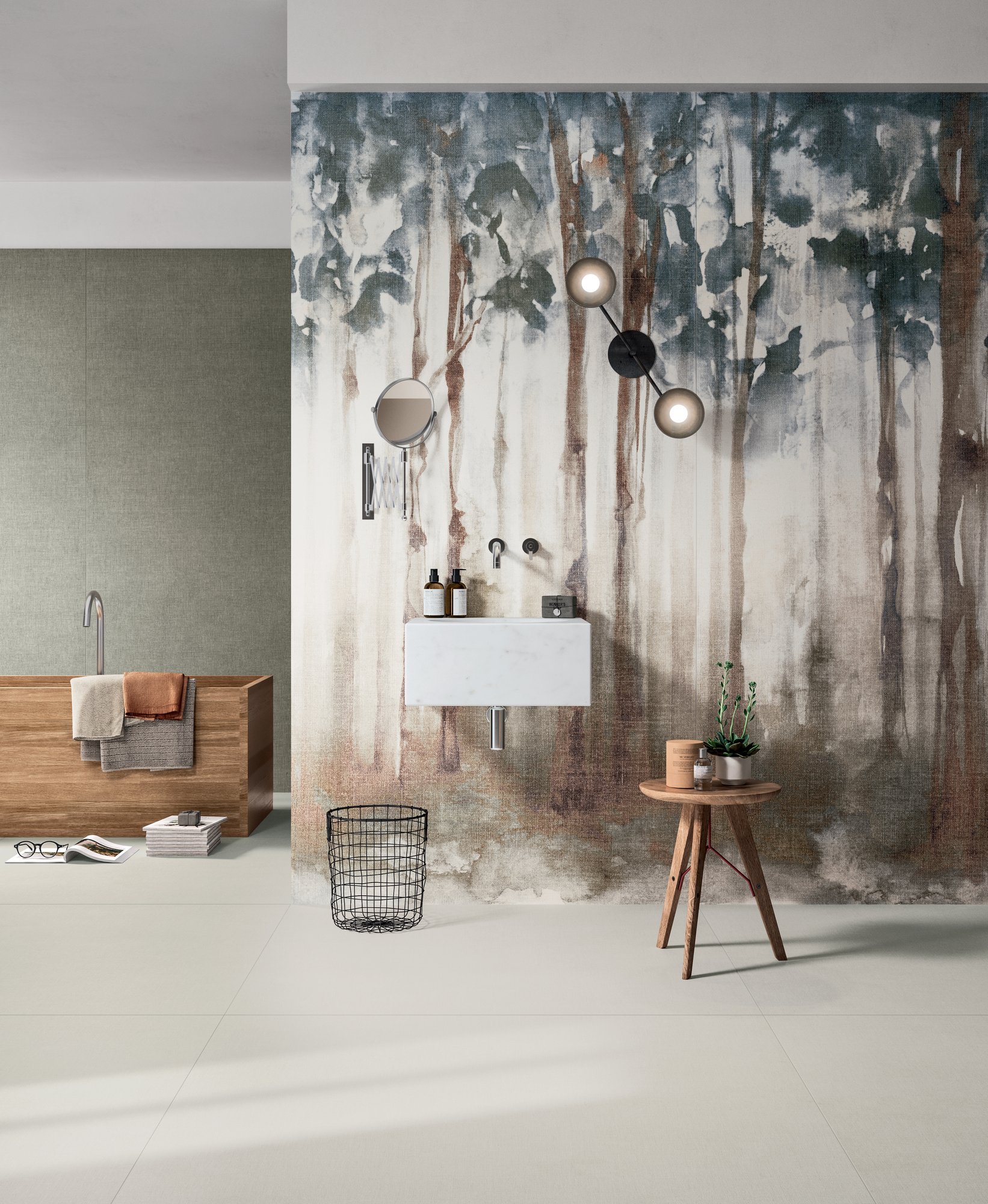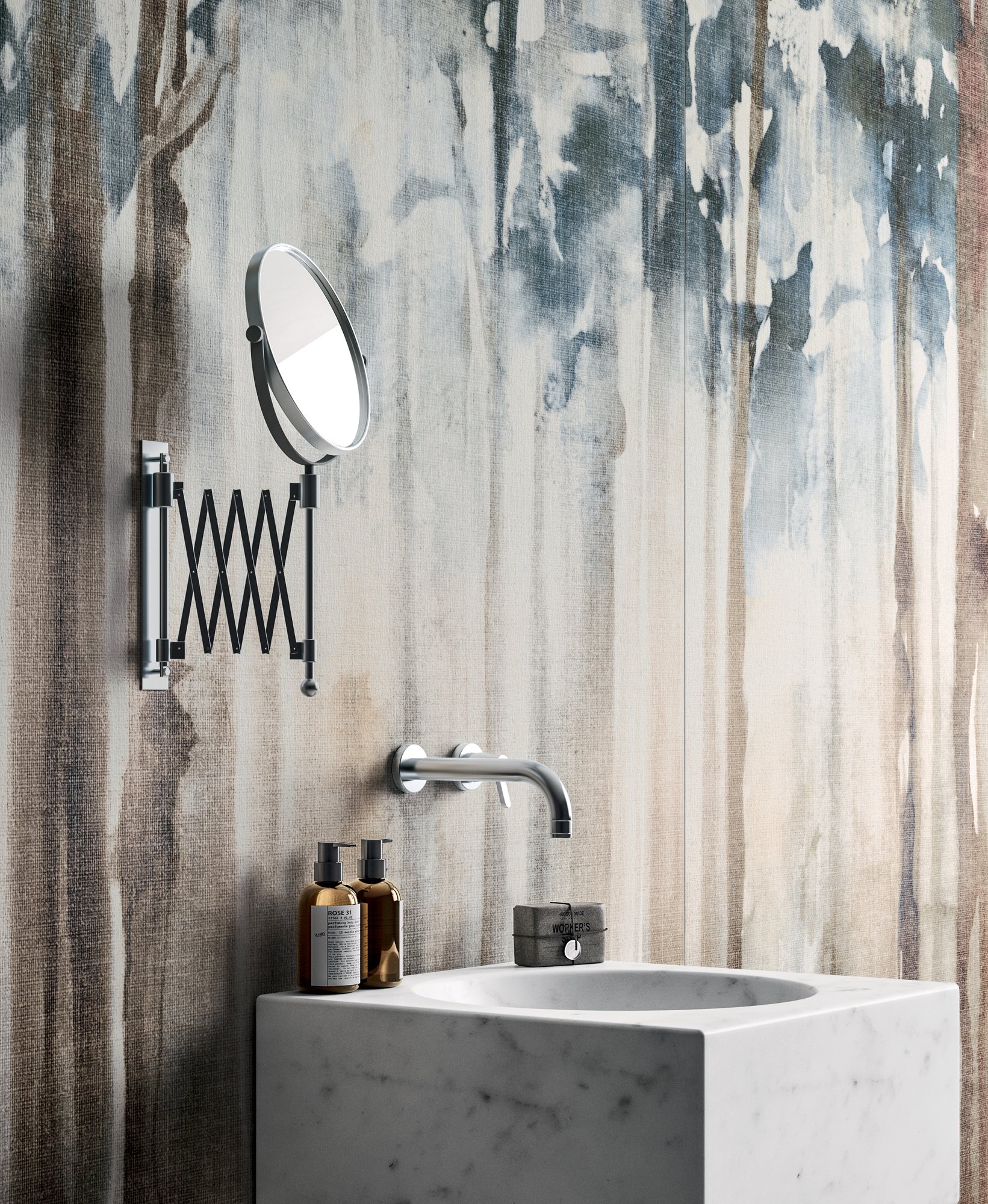 The surface of Rainforest looks and feels like hessian material, but it is actually a beautiful porcelain picture slab. It has a subtle cream background with browns, teals and greens to create the illusion of a forest in your home. It can be used to great dramatic effect in bathrooms or for that matter any room. Prices start from £195.00 per square metre. Due to the nature of the design it is not possible to send out samples of this product, but if you would like to see what it looks like, please come to our Chiswick Showroom where it is featured on one of the office walls.